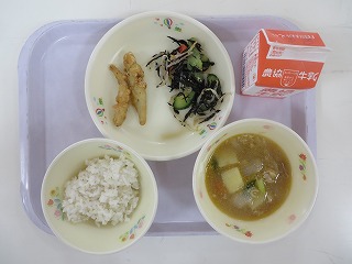 むぎいりごはん わかさぎフリッター ひじきのナムル 韓国風肉じゃが 牛乳
