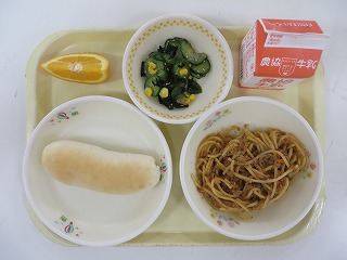 ミルクロール スパゲティミートソース わかめサラダ オレンジ 牛乳