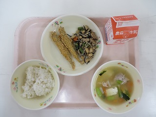 むぎいりごはん 魚の竜田揚げ かみかみサラダ 卵スープ 牛乳