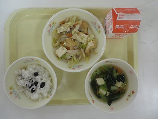 黒豆ごはん 厚揚げとキャベツのみそ炒め すまし汁 牛乳