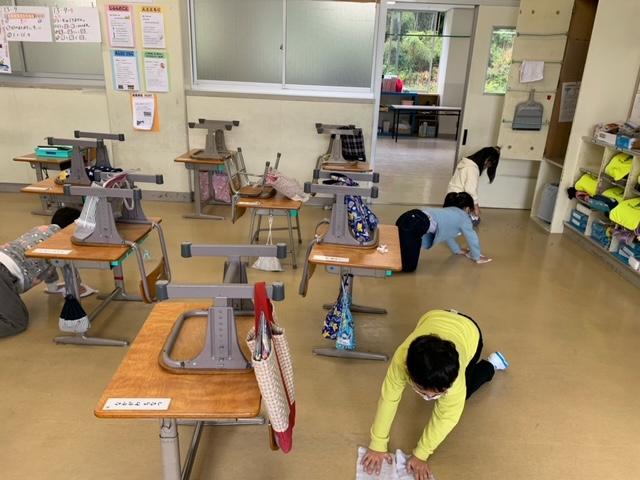 机の脚まで雑巾がけをしている児童もいました。