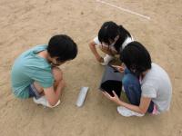 今日は、「水たまり発見器」を使って運動場のどこに水たまりができるかを調べ、予想しました。