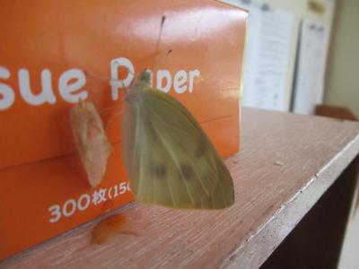 今朝、3年生が「先生!モンシロチョウがさなぎから成虫になっています!」との報告。