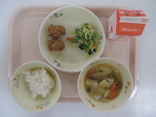 むぎいりごはん 鶏肉のごまがらめ おひたし のっぺい汁 牛乳