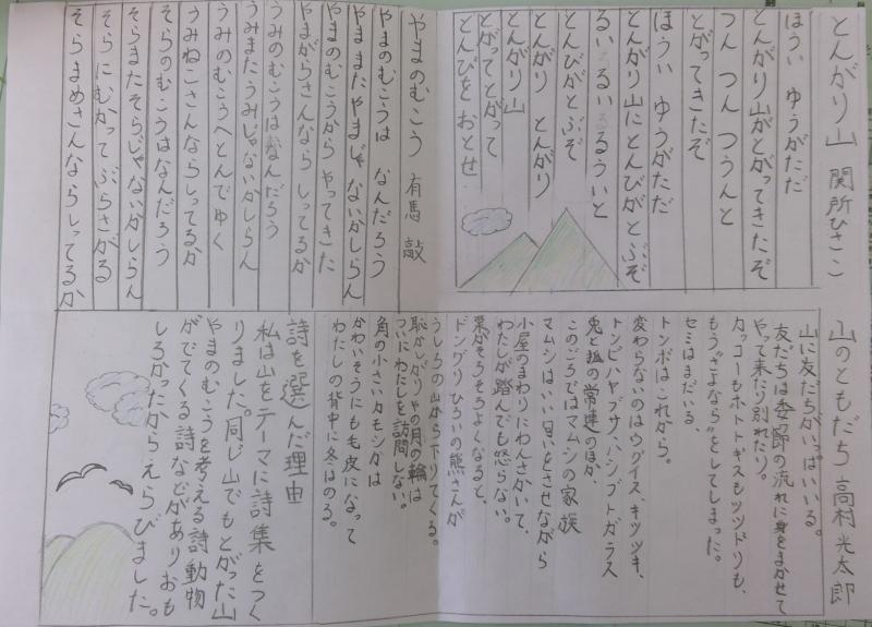グループで作った詩集を読み合う時間では、「目のつけどころがおもしろい。」「同じテーマの詩でも、読んでみると感じ方が全然ちがう。」などの感想が挙がりました。