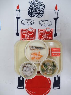 うるち米のごはんに、煮ておいた小豆を混ぜたごはん、正式には尾頭付きの魚ですが、子どもたちにも食べやすいいわしの竜田揚げ、紅白のなます、汁物には能登地方や福井県でもよく食べられている打ち豆を入れました。