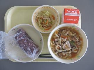 むぎいりごはん イカチリソース 切干大根のナムル 中華風卵スープ 牛乳