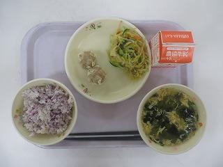 むぎいりごはん 揚げ大豆 中華あえ みそ汁 牛乳