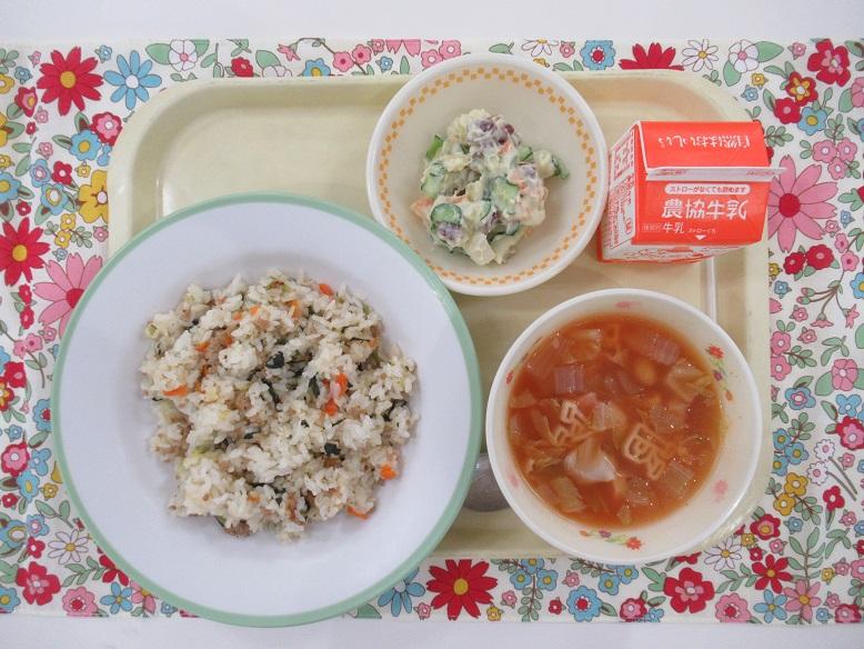今日は、ミネストローネスープに入っているアルファベットマカロニを探しながら食べている子がいました