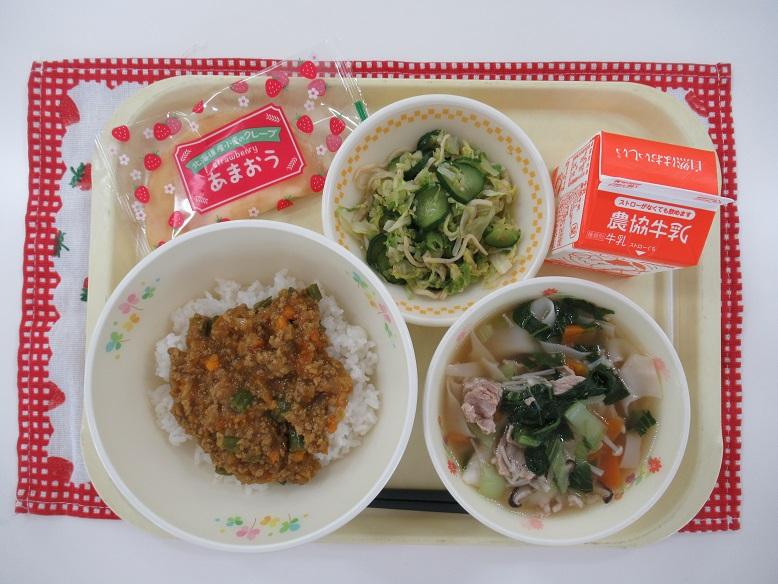 先に食べていた子に「カレーそぼろ丼、おいしい?」と聞いている子がいました。