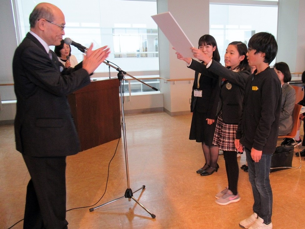 児童会環境委員会担当教諭、環境委員会委員長と副委員長が代表して出席し谷本知事様よりエコギフトの目録をいただきました。エコギフトとしてテレビが贈呈されました。児童の教育活動に役立てていきたいと思います。