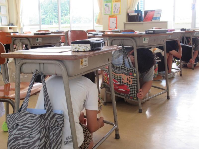 「県民一斉防災訓練(シェイクアウトいしかわ)」に、本日、本校も参加しました。地震のゆれから身を守る訓練です。児童は、放送と先生の指示を静かに聴き、「①しゃがむ・②隠れる・③じっとする」の「安全行動(3必)」をそれぞれの場所で行いました。