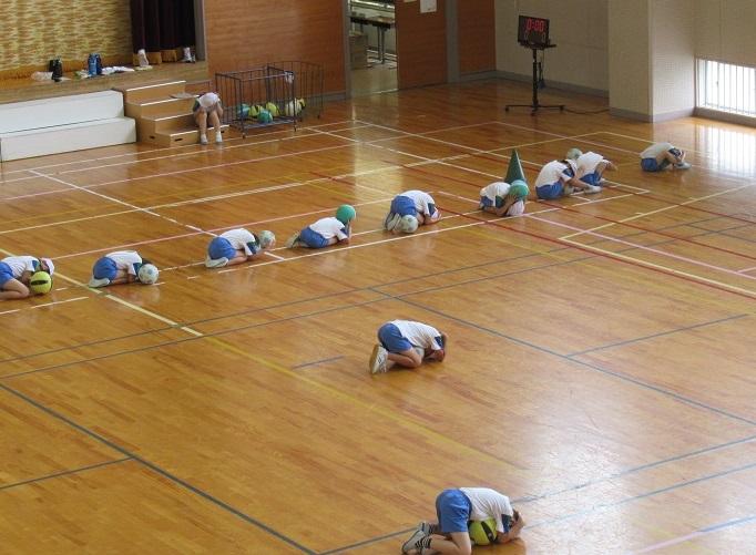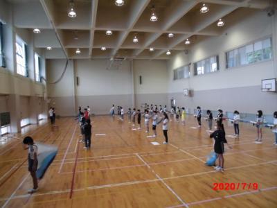 天候に恵まれずなかなかプールに入れない1年生ですが、28日の火曜日、体育館での体育も元気いっぱい頑張っています。