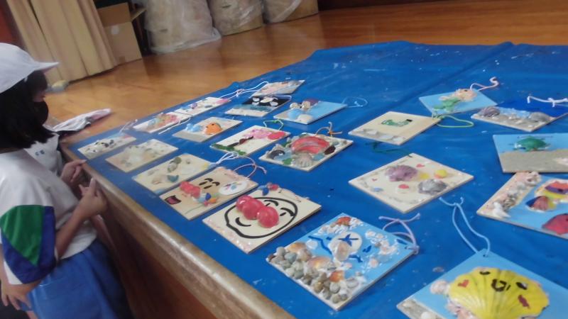 石と貝の壁飾りでは、貝に色を塗ったり、砕いたりしながら、一人ひとりが作品を作っていました。砂浜に落ちている貝で作る工作。海のよさを改めて感じる機会にもなったと思います。