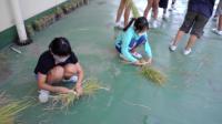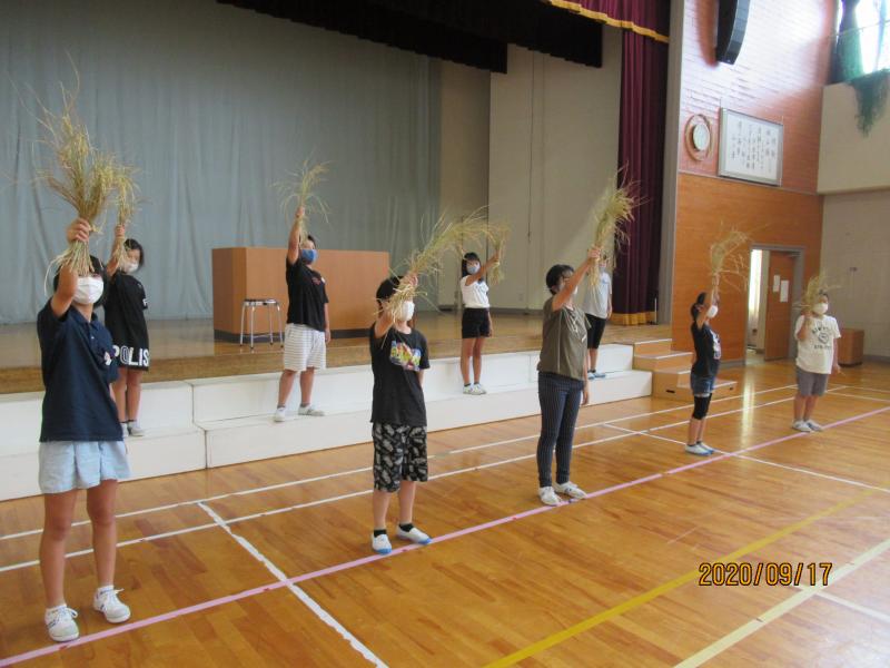5年生が学校で育てていたお米の稲刈りをしました。夏休みには、家にもって帰って水やりをしていました。残念ながら、かれてしまったり病気にかかったりした稲もありましたが、元気に育った稲もたくさんありました。一人ずつ束にしばって、はざの代わりに、ベランダの手すりを使ってほしました。精米をして、お米を食べる日をみんなで楽しみにしています。