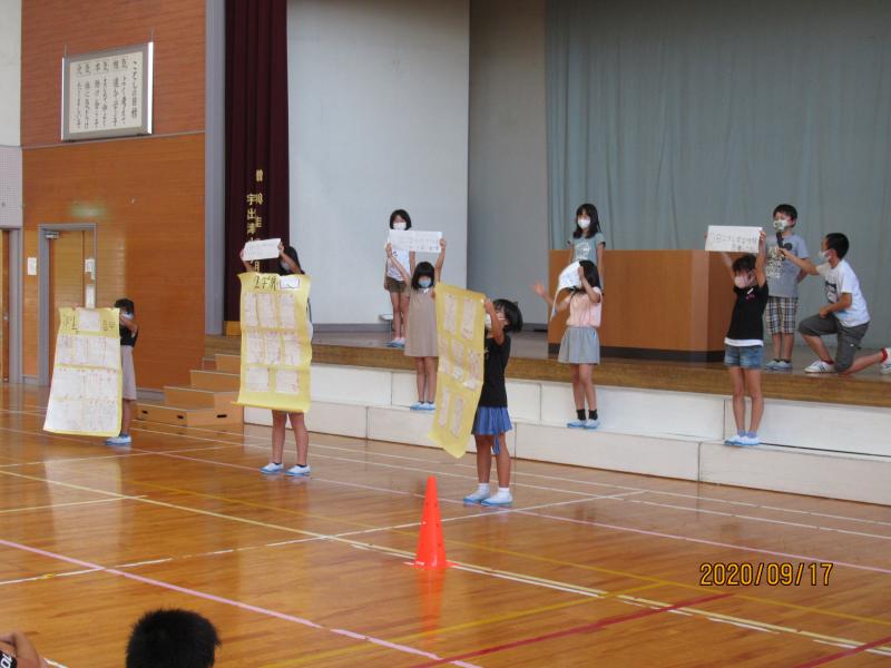 9月17日(木)に、児童集会が行われました。これまで委員会をまとめてきた各委員長が、前期の活動の振り返りと後期委員会にもつなげたいことを伝えました。「委員会の仕事を責任をもって行うことができた。」と振り返る各委員長の姿からは「やりきった」という達成感が感じられました。