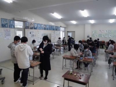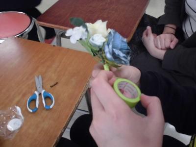 12月10日(木)に6年生とひまわり学級の親子行事が行われ、卒業式のときにつけるコサージュを作りました。