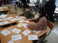 1年生は、生活科の「みんなであそぼう」の学習も兼ねて、クリスマスパーティーを計画しています。グループごとに秋の素材(まつぼっくりやどんぐりなど)を使い、輪投げや的当てゲーム、魚釣りゲームの計画をしています。おりがみでメダルなどの景品も作ったりして、楽しむ姿が見られました。