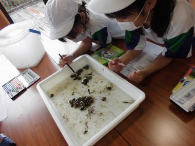 生き物が大好きな2年生は、様々な種類の貝や、カニ、小さなフグなど、たくさんの海の生き物を見つけることができました。