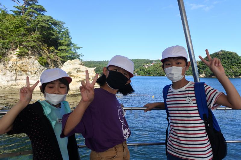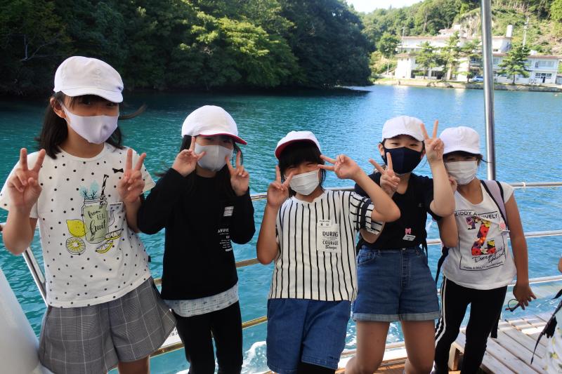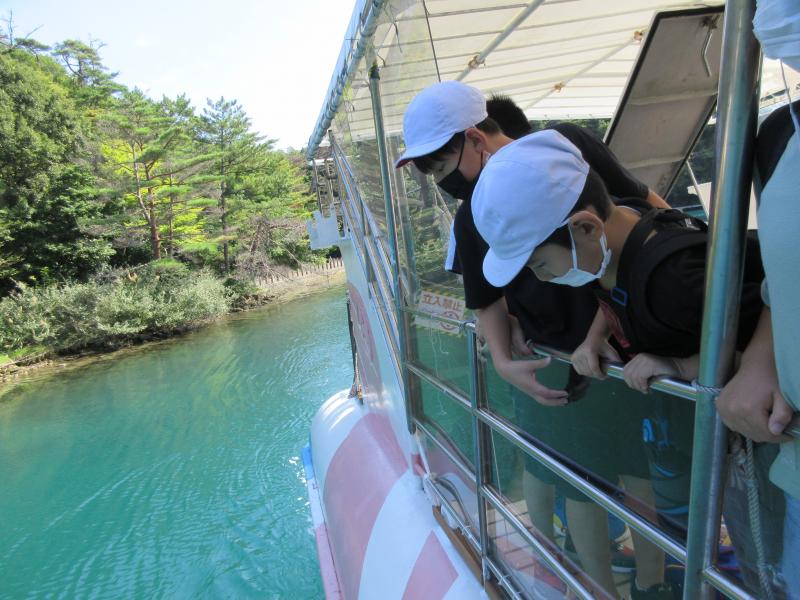 船酔いに心配な人がたくさんいましたが、、、船が動き出すとおおはしゃぎの3年生。普段見ているお魚や海も、船の上から見るとより輝いて見えましたね。船内の階段を降りると、海中の様子も見ることができ、魚を間近で見て大興奮!思い出に残る九十九湾遊覧でしたね。