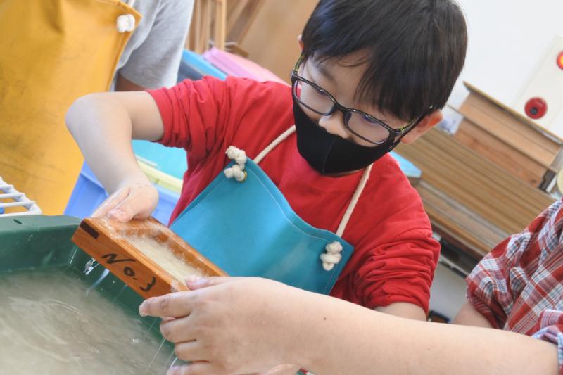 紙漉き体験だけでなく、DVDも見せていただき、紙料がどのように作られているのかについても学びました。子どもたちは「木の皮から作られていたんだ!」「混ざっている小さいごみを手作業で取っているんだ!」「冬に作業するのか。大変そう・・・。」と、「紙料ができるまで」の大変さを感じていました。