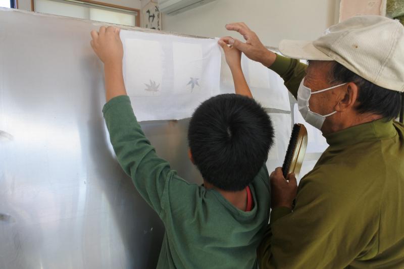 紙漉きでは、楮の繊維が混ざった紙料を触ったり、和紙を乾かす特別な機械に貼り付けたりしました。3年生は、初めての体験に緊張しながらも、丁寧に作業をしていました。