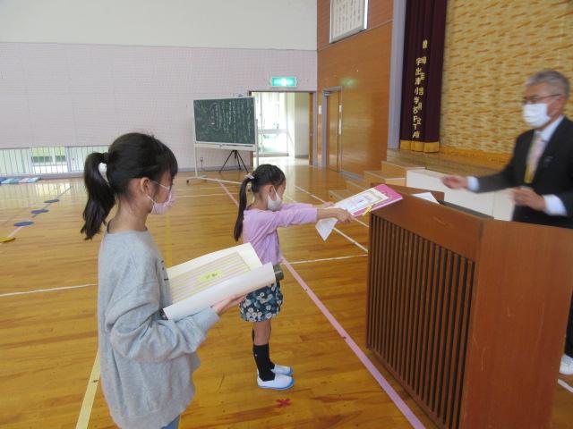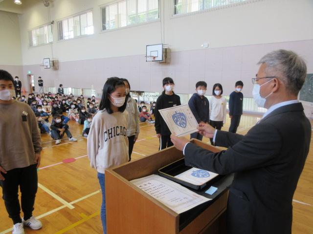 集会では、まずはじめに、計算コンテストや夏休み応募作品、読書感想文の表彰が行われました。