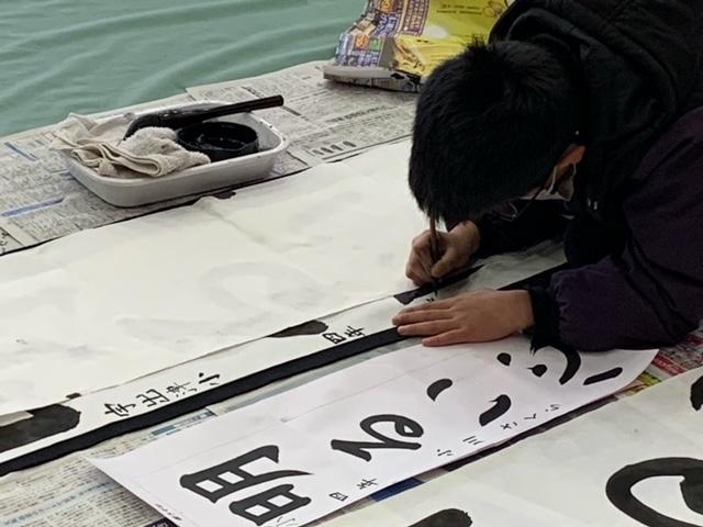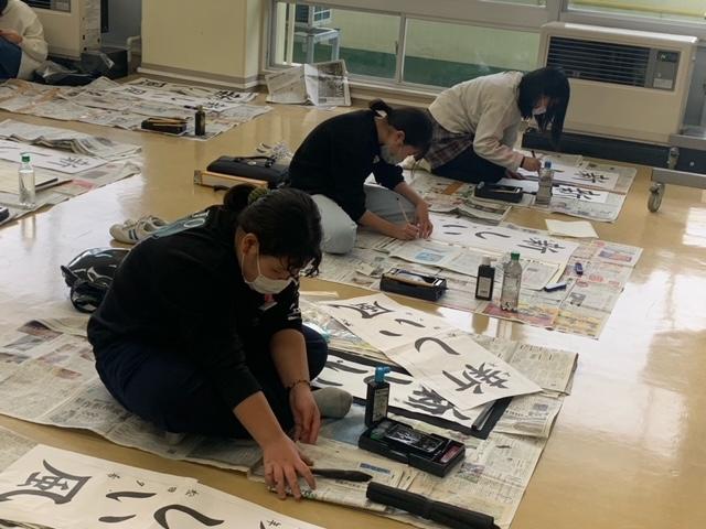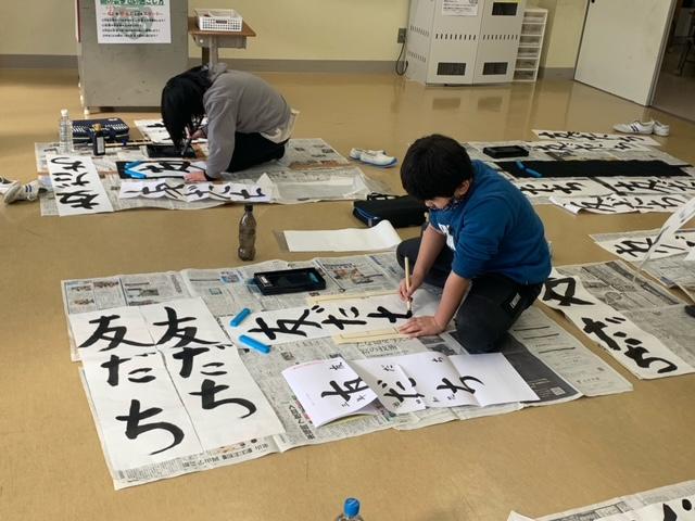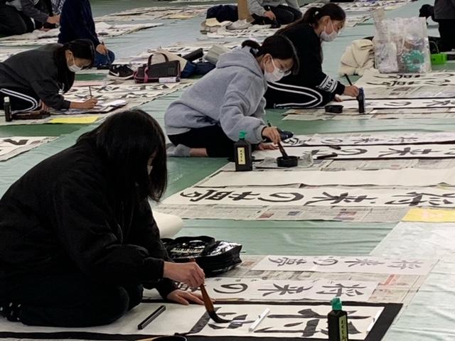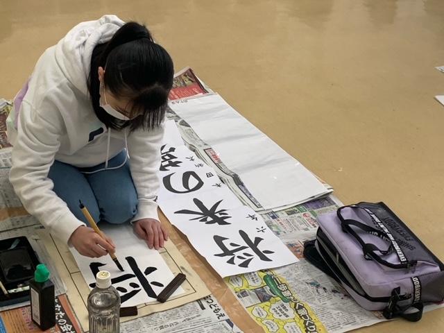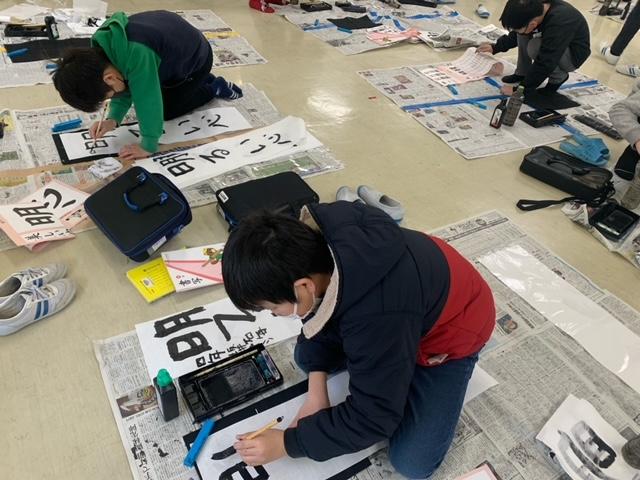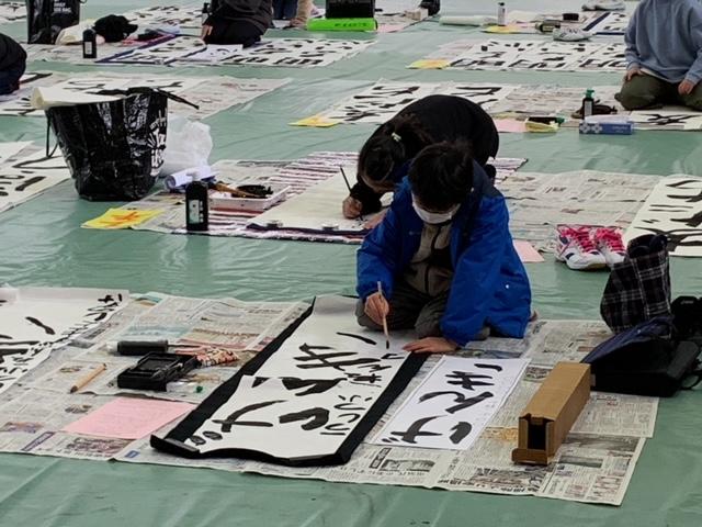 宇出津小学校から、たくさんの児童が参加しました。筆にたっぷりと墨をつけ、大きな半紙に各学年の課題の文字を書いていました。
