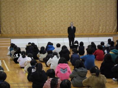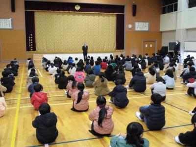 1限目、体育館で3学期始業式が行われ、久しぶりに全校児童が集まりました。