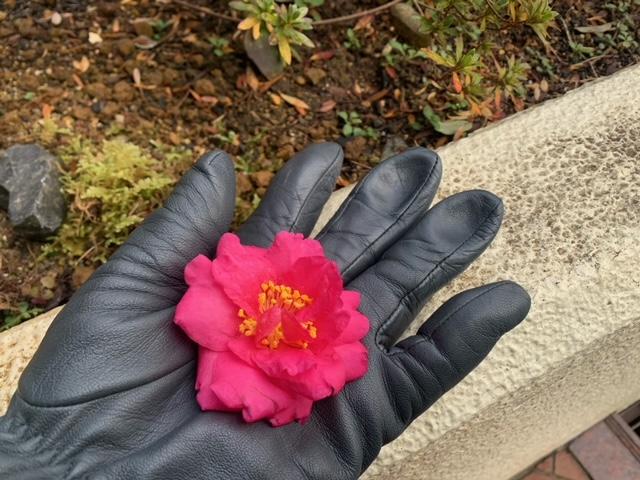 1つ目は、写真の花です。ツバキですね。はなびらの赤と花粉の黄色のコントラストがとても鮮やかです。児童が、「おはようございます。これプレゼント!」と言って渡してくれました。とても嬉しかったです。