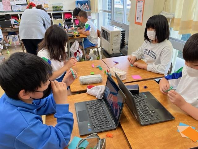 写真は5年生のようす。一人一台端末を使って、鶴の折り方を動画でみながら作っていました。折り方を間違える児童もいましたが、「ここは、こうやるんだよ。」と、友達同士教え合っていました。