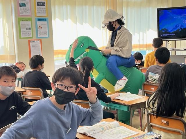 5年生の外国語の時間には、馬に乗ったエイミーさんが現れました。