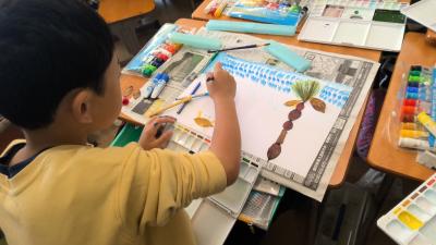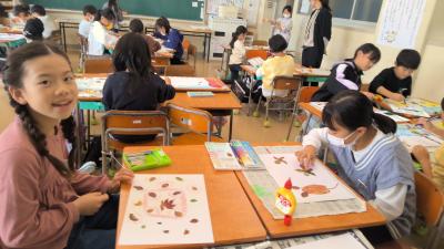 3年生が大好きな図工の時間。この日は、落ち葉を拾って、その葉っぱを使った絵を描きました。