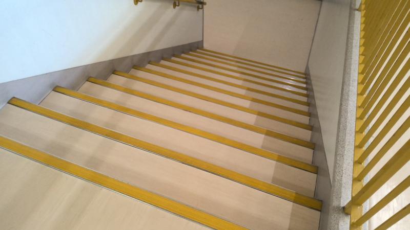掃除の時間、ある掃除場所で、一生懸命廊下を磨く宇出津っ子の姿を目にします。階段のすべり止めの黄色いゴムの部分を、ごしごし何度もこすって汚れを落としてくれています。みんなが何気なく歩いている廊下ですが、黄色いゴムの部分を雑巾でこすると、真っ黒い汚れが落ちるんです。