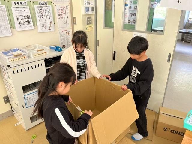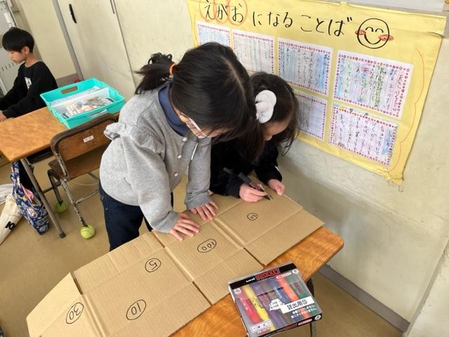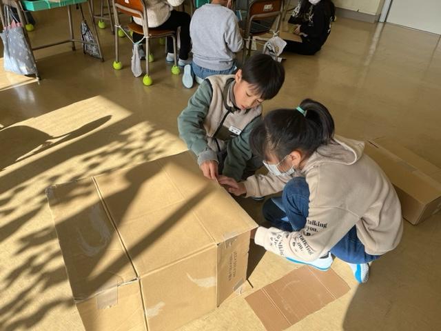 自分の背の高さと同じくらいの段ボールを組み合わせたり、マジックで得点の表示板を作ったりしていました。何ができるのか、完成が楽しみです。