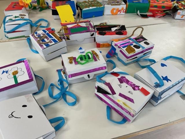 1年生の教室や学習室にはどんぐりや松ぼっくり、お菓子の箱や空き缶などの身の回りにある材料で作られたゲームがたくさん並べてありました。