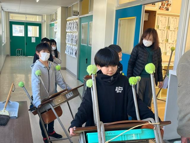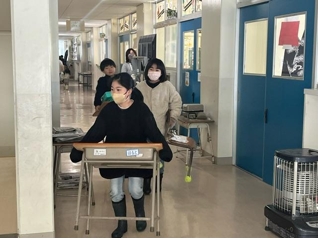 学校再開にむけ、宇出津っ子は協力して教室の机といすを運んでいました。自分のものだけでなく、友達の分も一生懸命運んでくれました。