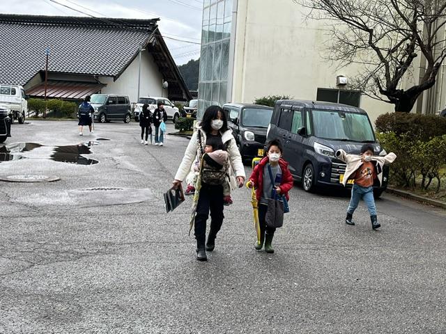 宇出津っ子の元気な姿を見て、微笑んでいる避難者の方がいました。