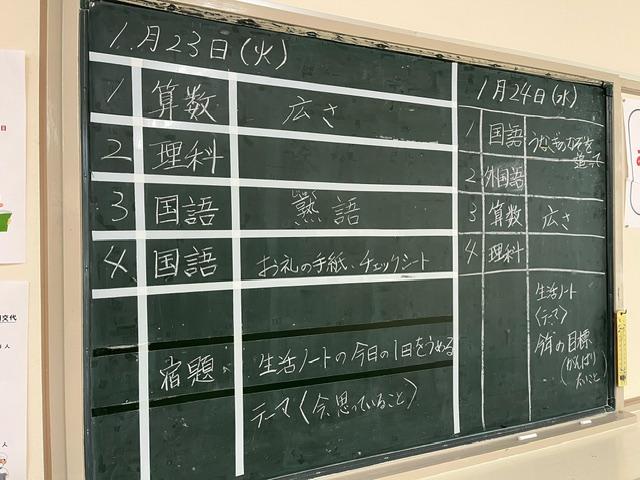 やっぱり慣れた場所。落ち着いて学習することができたようです。3年生と4年生は、まだ違う場所での学習ですが、後ろの黒板を見るとしっかりと学習内容が書かれていました。
