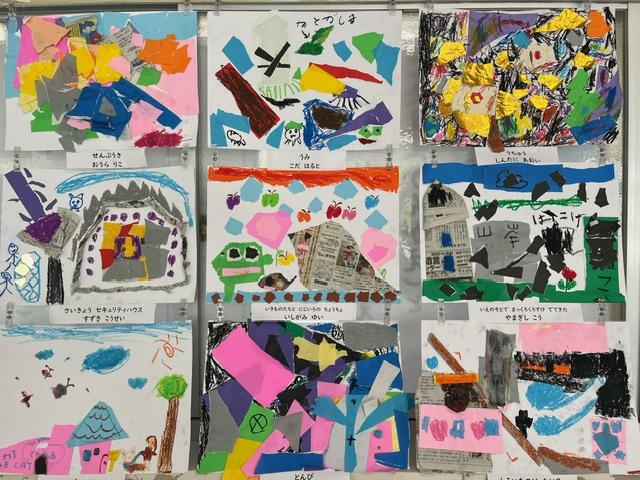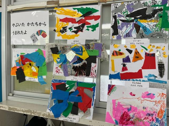 廊下には、図工の時間に制作した作品が飾られています。元気いっぱいの1年生!