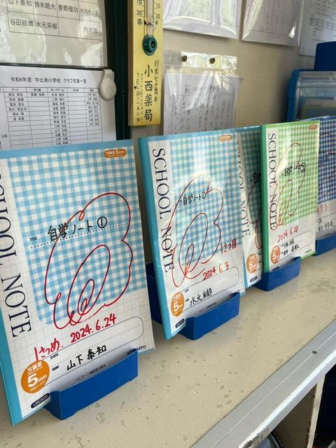 どの学級も一生懸命漢字の練習をしてきました。写真は、5年生の予定黒板と自学ノート。