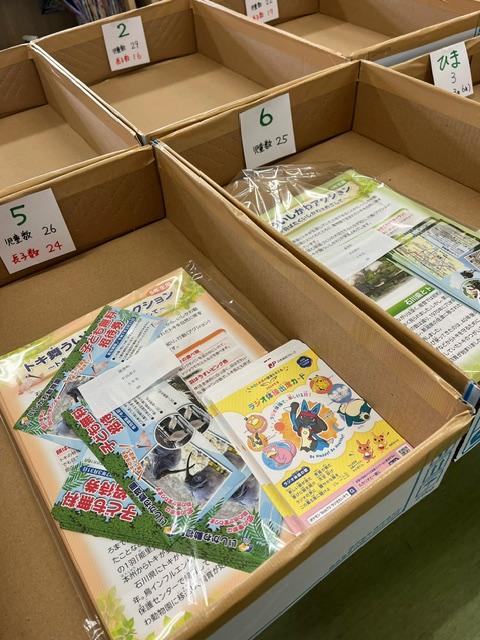 職員室には、各学年の夏休み用の配付物が用意されています。