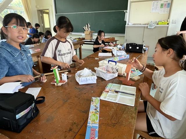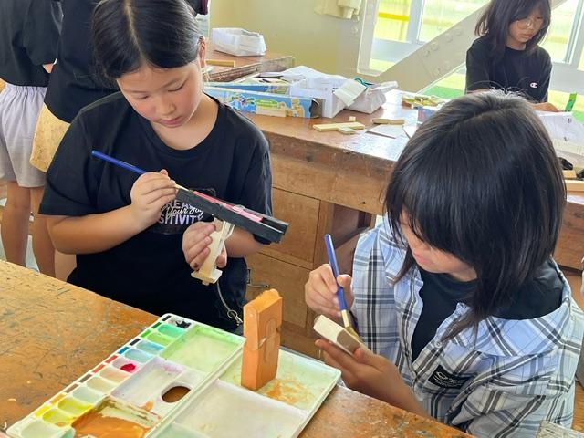 のこぎりで木を切り、くぎを使ってつなぎ合わせたり、動くように工夫したり・・。最後は、絵の具で色塗り!