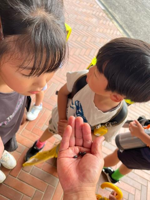 「これ!ダンゴムシ。3匹。落とさないでください。一番大きいの、これ!」