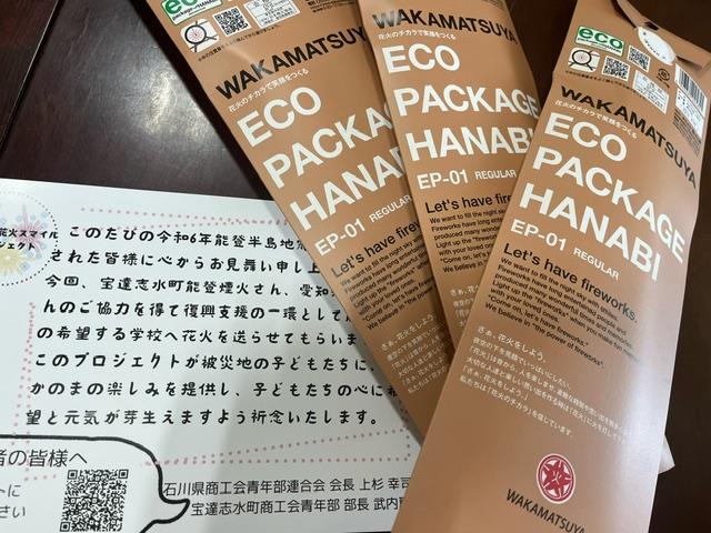 今日は、愛知県にある若松屋の社長さんをはじめ、石川県商工会青年部、宝達志水町商工会青年部、能登町商工会青年部の皆さんのご支援で、全校児童に花火のプレゼント!