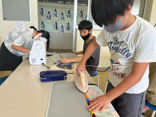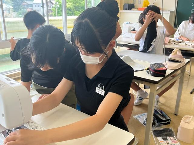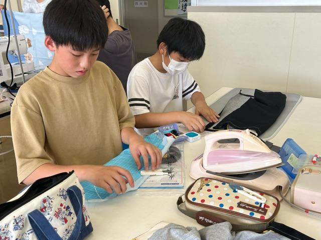 家庭科でエプロンづくりをしていました。針を使って縫っている人、ミシンを使っている人、アイロンをかけている人。