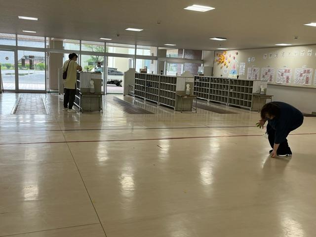 こんな暑い中、宇出津っ子のために、児童玄関の歯みがきのポジションシールを新しく交換していただきました。