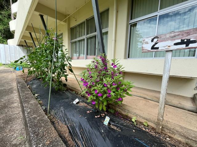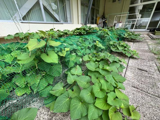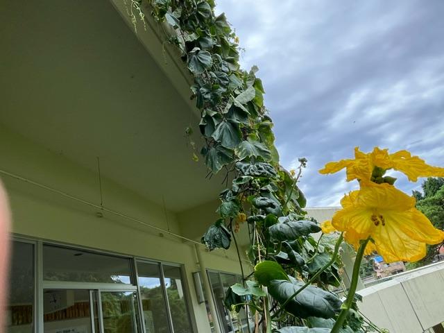 花壇に植えられているピーマン・ホウセンカ・サツマイモは、すくすく育っています。先日紹介したヘチマもどんどん大きくなっています。