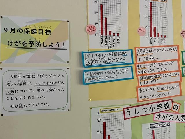児童玄関には、1学期に学習したことを実生活に結び付け、グラフを作成したものが掲示してありました。数値だけではわかりにくいけど、グラフを見ることで一目瞭然!