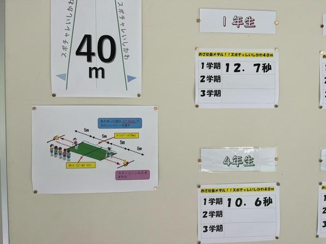 体育館横の廊下には、40m走の1学期の記録が掲げられていました。2学期にどんな記録が出るか、今から楽しみです。
